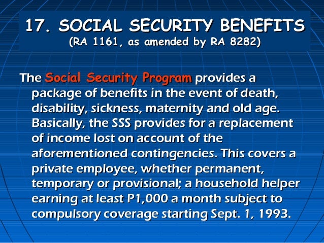 Republic act no.8282 social security law purpose republic act no. 1161, as amended, otherwise known as the social security law ... Fetch Content